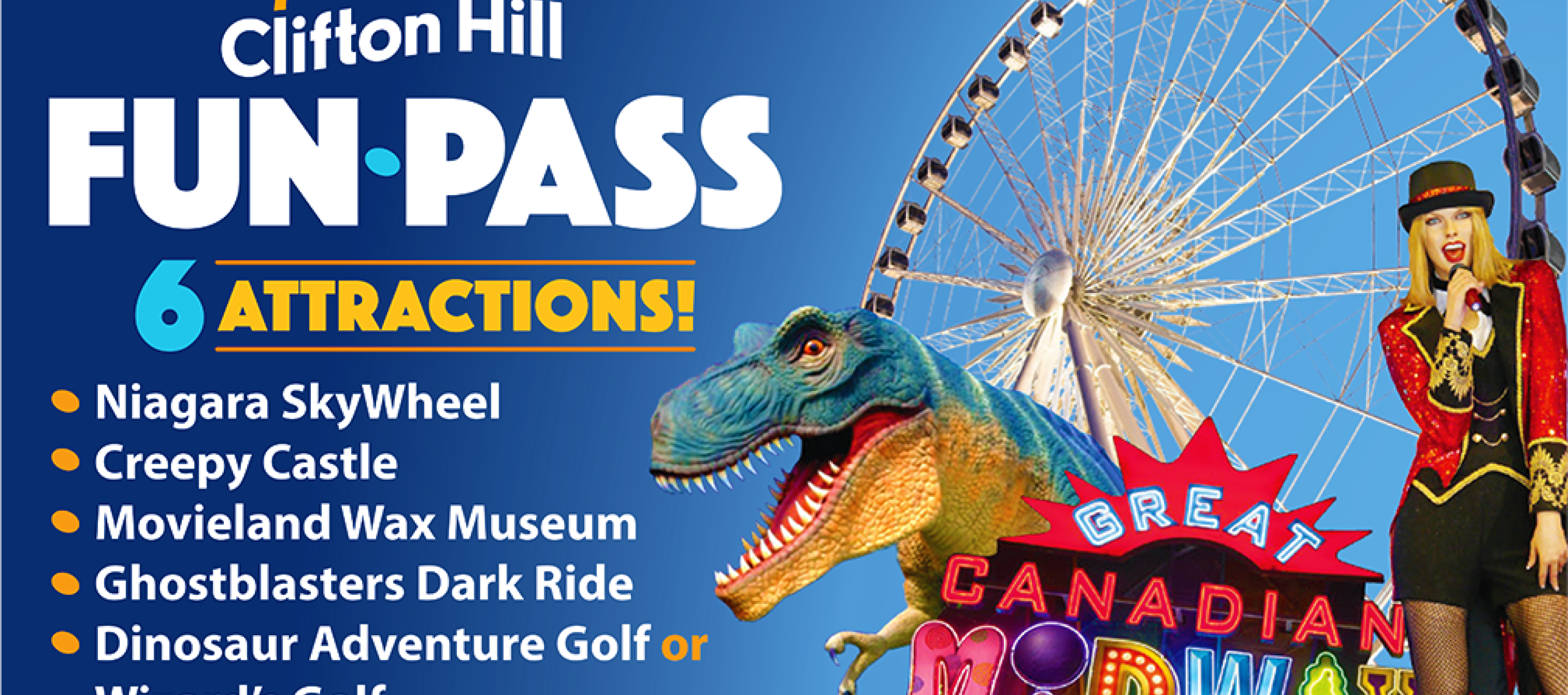 Six attractions, one low price! Save $30 off individual attractions and conveniently order direct online. The Clifton Hill Fun Pass includes admission to the Niagara SkyWheel, Creepy Castle, Movieland Wax Museum, Dinosaur Golf or Wizards Golf, Ghost Blasters, Toy Store 4D Ride or Carnival Chaos Ride. Fun Pass admissions can be used anytime within one year of purchase.